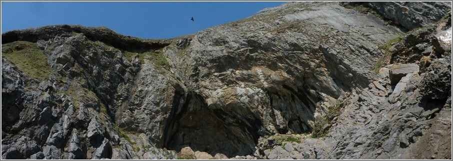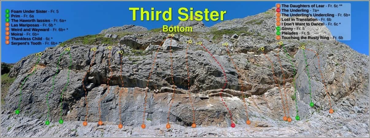 Began this topo 4 years ago (or so). It would normally be an awkward crag to photograph but, with 'Hugin', I was able to stitch together around 20 shots to get what we have here. It's turned out well. The full-size topo is 6,377 x 2,363 pixels. It can be seen on this page. Third Sister. (Click on the image to be offered the image at high resolutions).