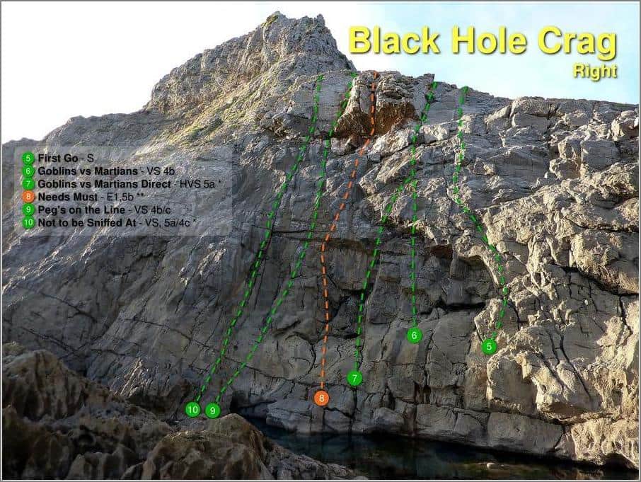 This crag has long since fallen out of fashion. We went there a few years ago and Gwyn climbed the V groove in the centre of the crag. I also made a topo and uploaded it, together with some action shots to the Wiki. See here: https://swcw.org.uk/wiki/Black_Hole_Crag