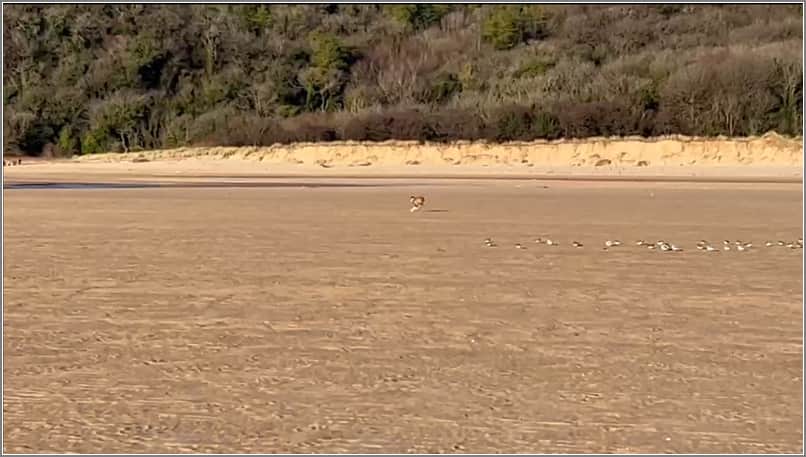 Ann's new dog, (still a puppy) chasing birds at Oxwich Beach.